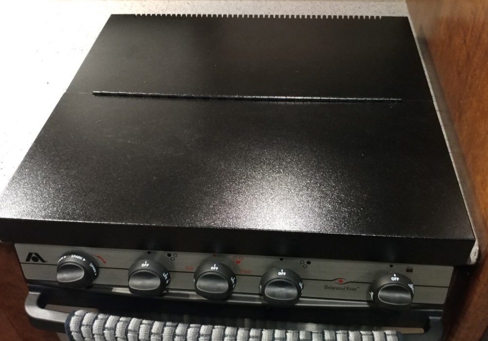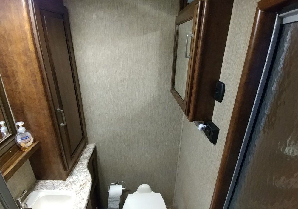 The bathroom in the Outback 324CG isn’t that bad except for one major problem. You can’t really spit in the sink after brushing your teeth! So, with permission from the wife, I ripped the cabinet off the wall which was preventing one’s head from aiming directly over the sink bowl. Please take a look at the installation in the Upgrades section!