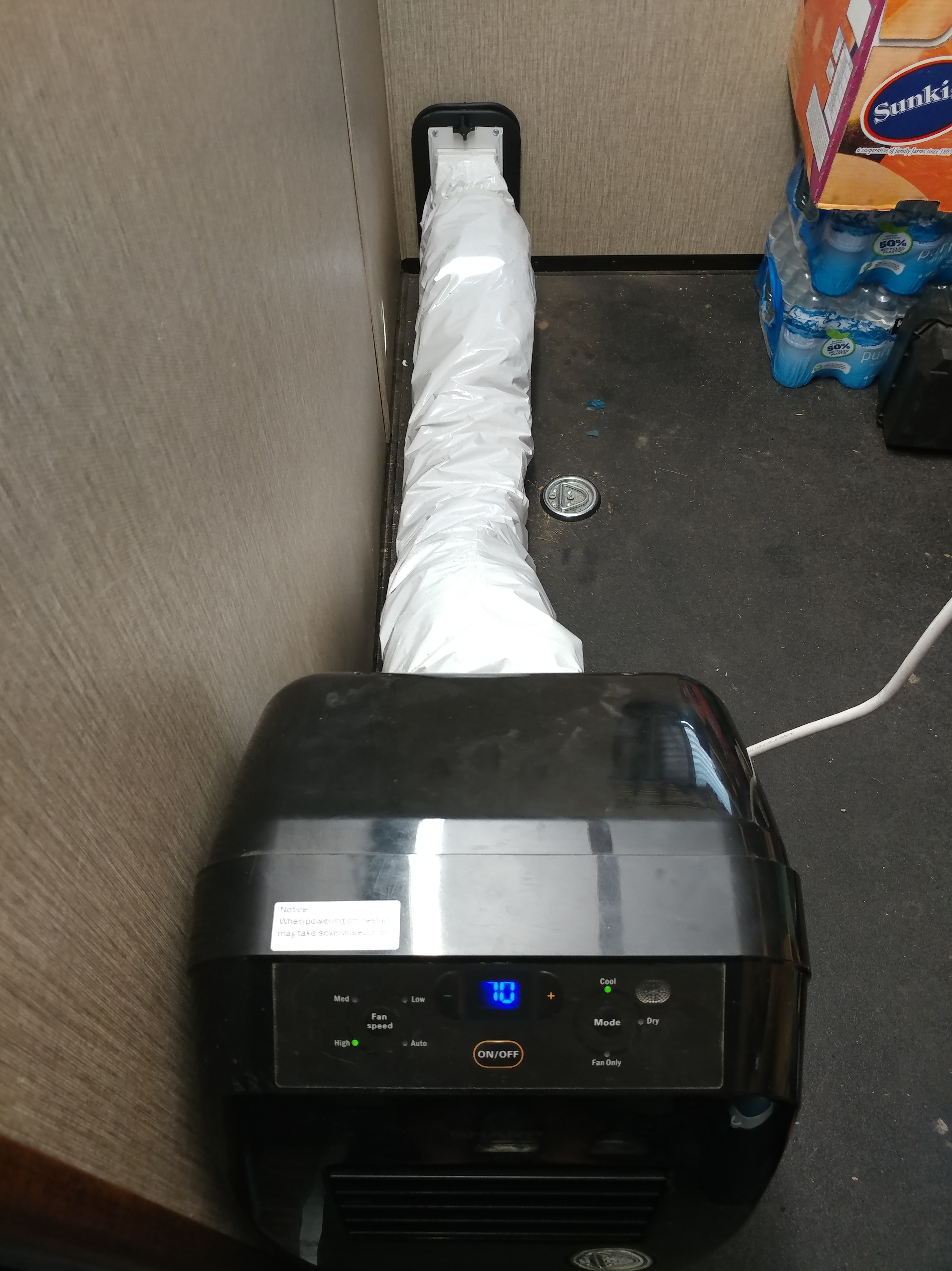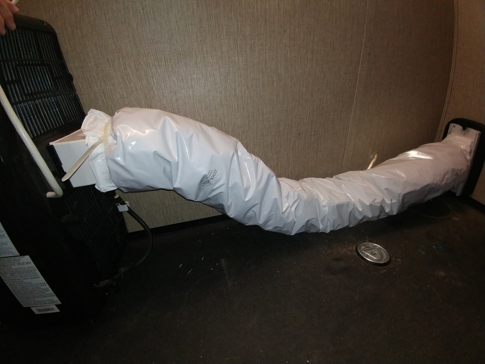 Well almost… The exhaust tubes on this kind of A/C get really warm and end up reheating the area which is counter productive. To mitigate that I’ll be installing a wrap that goes over the exhaust tube. I have been using one in my bedroom at home for a few years and it makes a HUGE difference. The wrapped tube is actually room temperature after installing the Cool-Aide so all the heat goes outside, nice!